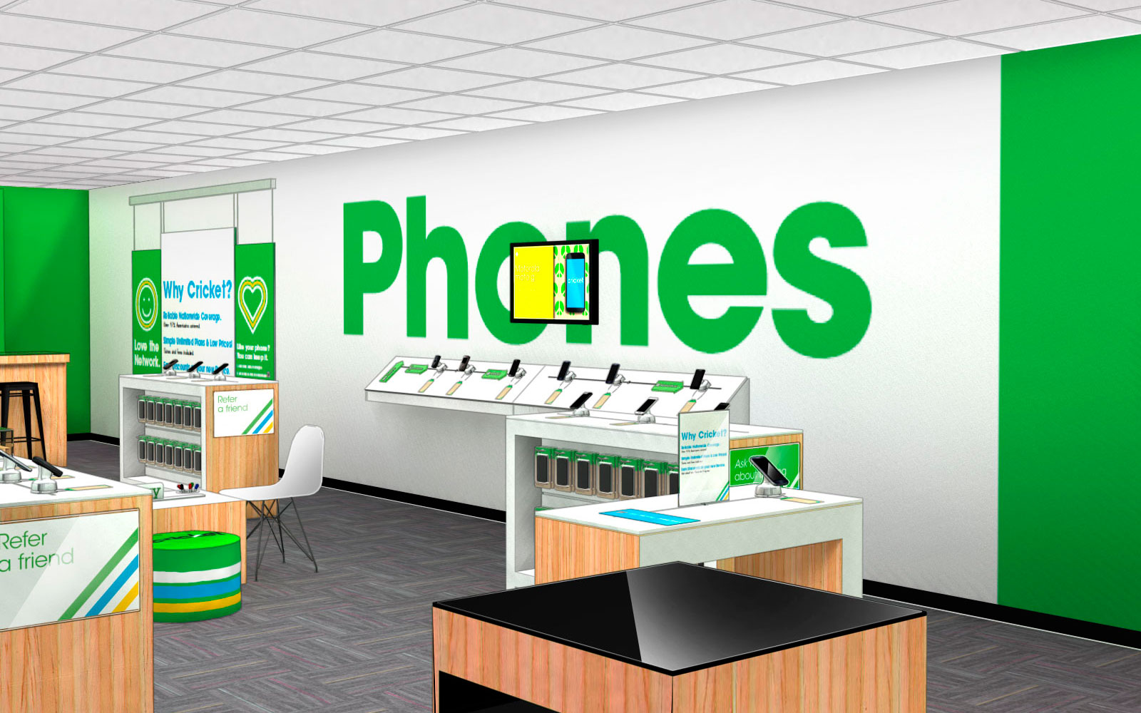 First and foremost was the need to re-establish trust and confidence in the Cricket brand. We reminded customers through exaggerated wall graphics that Cricket is backed by a nationwide network now, and that losing service was the last thing they would need to worry about. From there, it’s all fun and games—so every product in the store is available to interact with and play with.