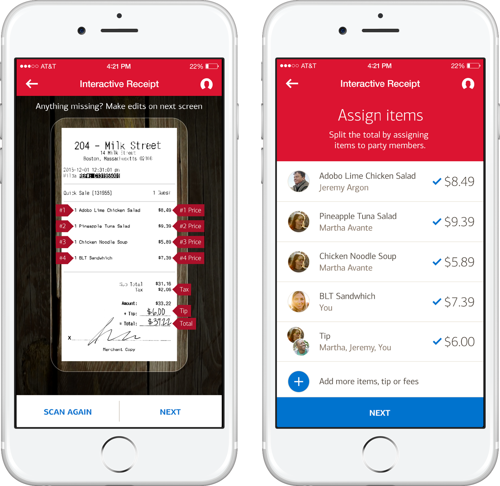 Out with your friends and need to split the bill? Scan your receipt, assign items, and we’ll do the math. Our receipt scan will automatically attribute the items and the amounts, even a handwritten tip. You can self-adjust if anything is missing or incorrect.